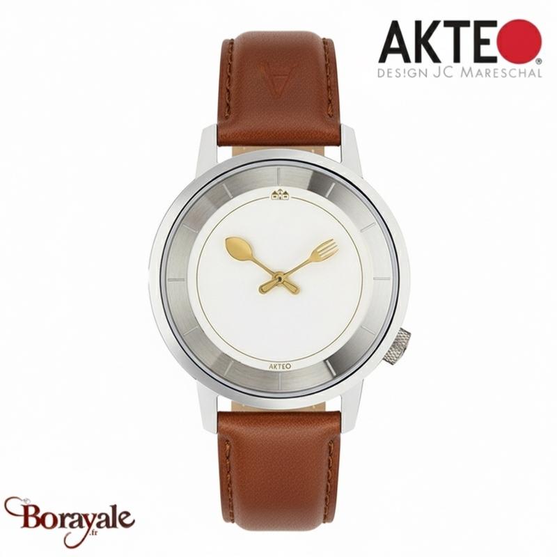 Montre française AKTEO, collection : Profession, modèle : Gastronomie 38 mm argent ronde, équipée d'un bracelet cuir surpiqué cognac de 18 mm référence PGo01