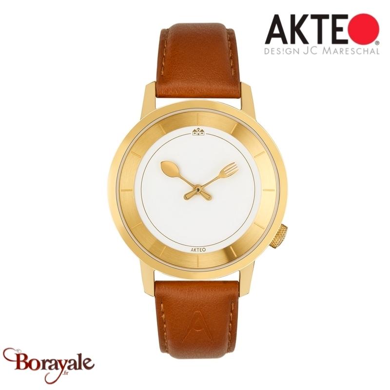 Montre française AKTEO, collection : Profession, modèle : Gastronomie 38 mm dorée ronde, équipée d'un bracelet cuir surpiqué cognac de 18 mm référence PGo02