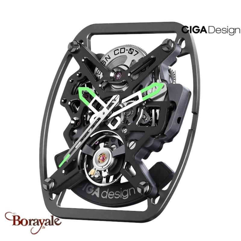 Mecanisme : La montre est animée par le calibre automatique CD-07, un mouvement interne (in-house) développé par Ciga Design. Il bat à une fréquence de 28 800 (4 Hz) et dispose d'une réserve de marche d'environ 40 heures. Le rotor, visible à travers le fond transparent, est en forme de "ancre", ce qui ajoute une touche de design supplémentaire.