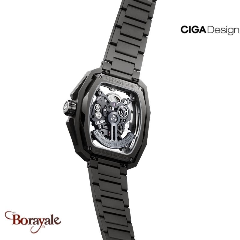 Le cadran est entièrement squeletté, offrant une vue dégagée sur le mouvement mécanique. Ciga Design a poussé le concept en augmentant la visibilité de 200% par rapport à des montres squelettes classiques. Les ponts et la platine du mouvement sont ajourés, brossés et polis pour mettre en valeur le travail d'horlogerie. Cette transparence permet d'observer chaque détail du mécanisme en mouvement.