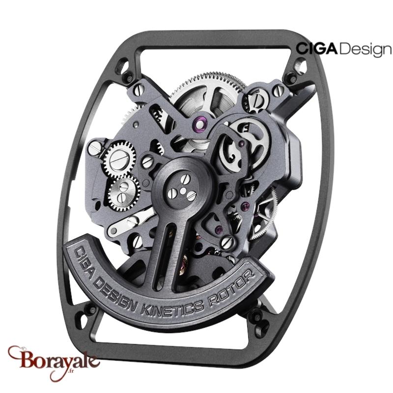 Cadran : entièrement squeletté de face comme de dos, offrant une visibilité à 360 degrés du mouvement. Les ponts et la platine sont ajourés pour maximiser la vue sur les rouages. Ciga Design annonce une visibilité accrue de 200 % par rapport aux montres squelettes classiques.