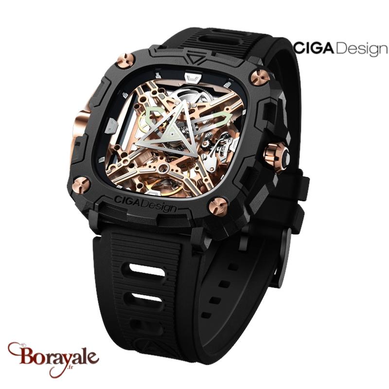 Mecanisme : La montre est équipée d'un mouvement automatique (à remontage automatique) CD-01, développé en interne par Ciga Design. Ce calibre bat à une fréquence de 21 600 alternances par heure (3 Hz) et offre une réserve de marche d'environ 40 heures. Le fond transparent permet d'admirer le mouvement, ce qui est un atout pour les amateurs de mécanique.