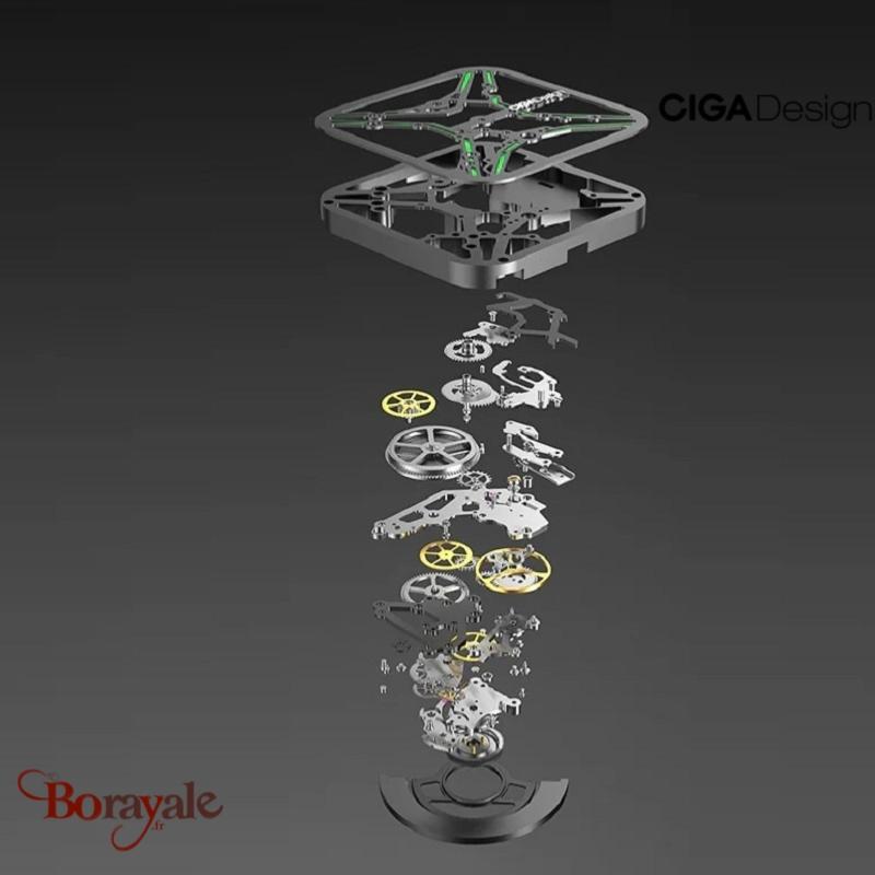 Mecanisme : La montre est animée par un mouvement automatique (à remontage automatique) CD-01, développé en interne par Ciga Design. Ce calibre, visible à travers le fond transparent, offre une réserve de marche d'environ 40 heures.
