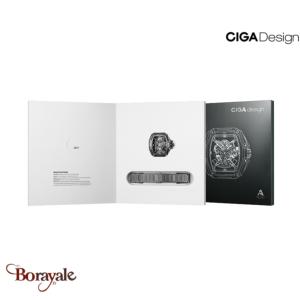 Cadran : entièrement squeletté, offrant une vue dégagée sur le mouvement mécanique. Ciga Design a poussé le concept en augmentant la visibilité de 200% par rapport à des montres squelettes classiques. Les ponts et la platine du mouvement sont ajourés, brossés et polis pour mettre en valeur le travail d'horlogerie. Cette transparence permet d'observer chaque détail du mécanisme en mouvement.