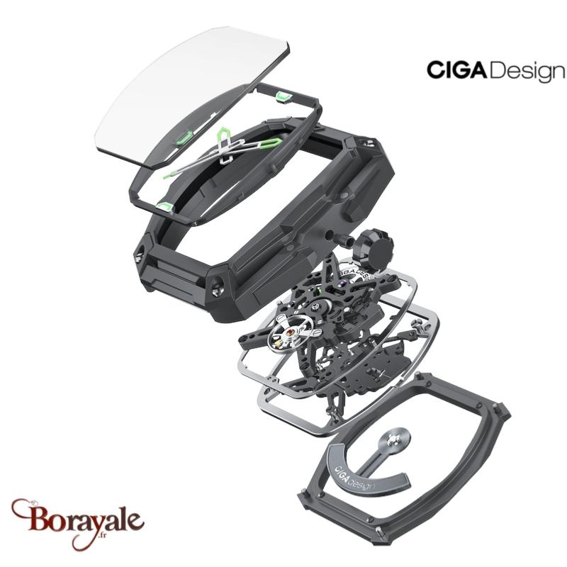 Le cadran est entièrement squeletté, offrant une vue dégagée sur le mouvement mécanique. Ciga Design a poussé le concept en augmentant la visibilité de 200% par rapport à des montres squelettes classiques. Les ponts et la platine du mouvement sont ajourés, brossés et polis pour mettre en valeur le travail d'horlogerie. Cette transparence permet d'observer chaque détail du mécanisme en mouvement.