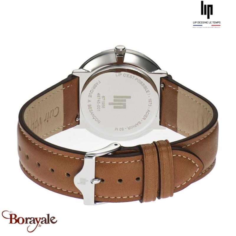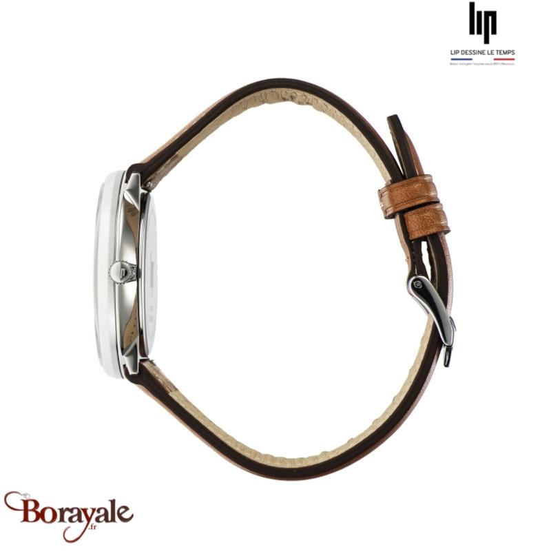 Verre : Verre Saphir bombé traité anti reflet : Le saphir est un verre synthétique fabriqué à partir d’oxyde d’aluminium cristallisé à hautes températures. Cette transformation fait de lui une matière particulièrement résistante et quasiment inrayable. Le verre saphir est utilisé sur tous les modèles haut de gamme de la marque LIP.