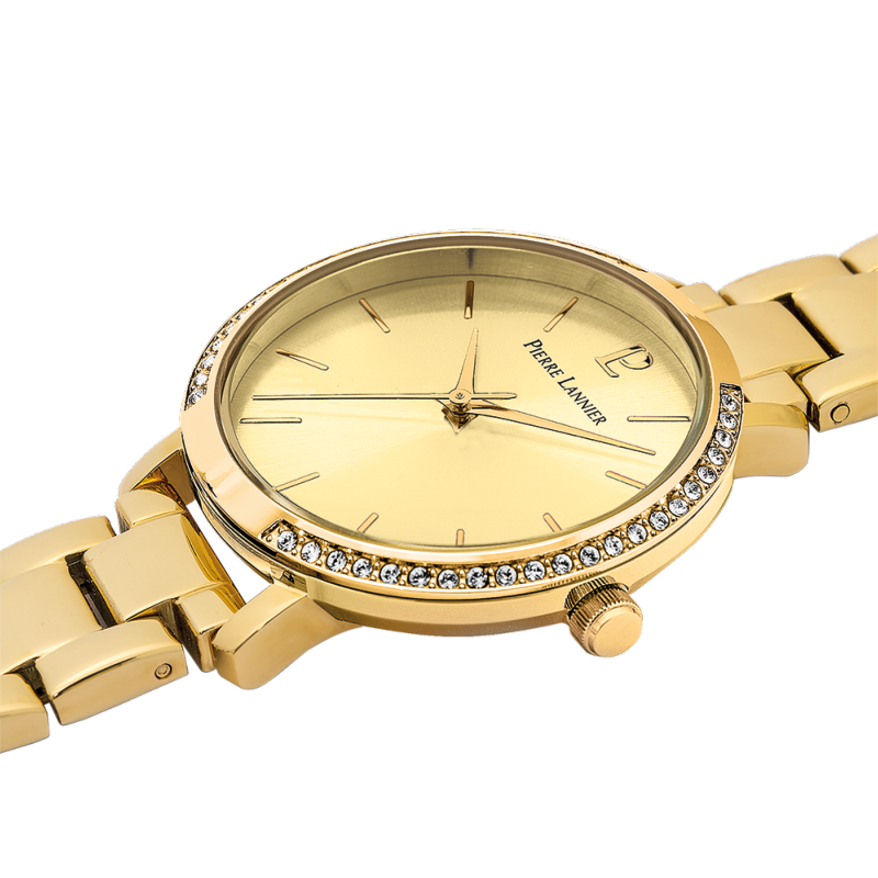 Laissez-vous éblouir par la richesse et l'éclat de la montre Chouquette 037H542 de Pierre Lannier. Ce modèle est une véritable pièce joaillière qui célèbre le luxe et la féminité avec son look entièrement doré et ses détails scintillants.
