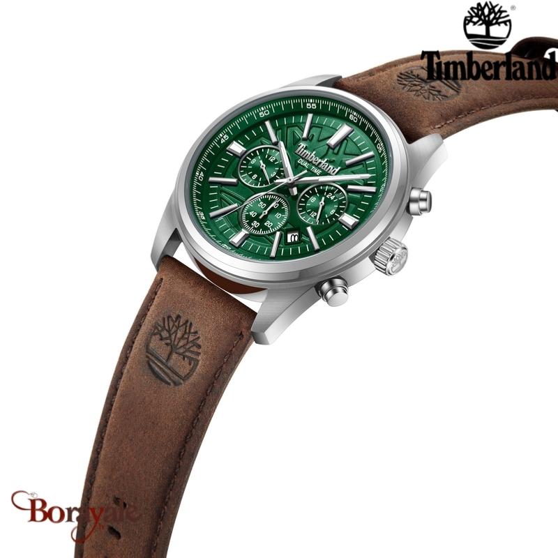 Bracelet Cuir Marron Chaleureux : La montre est complétée par un bracelet en Cuir véritable Marron, dont la teinte neutre et chaleureuse s'harmonise parfaitement avec le vert du cadran. Le cuir, symbole de durabilité et d'authenticité pour Timberland, garantit un port confortable et un vieillissement naturel qui ajoute du caractère à la montre au fil du temps.