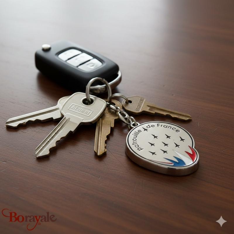 2. #en savoir plus#C'est un bel objet pour les passionnés d'aviation. Ce porte-clés est une reproduction fidèle de l'emblème de la Patrouille de France (PAF), l'unité acrobatique d'élite de l'Armée de l'Air et de l'Espace française.