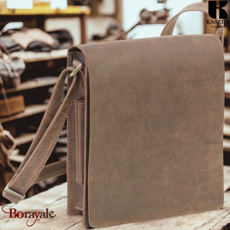 Sac bandoulière KASZER Kansas en cuir pleine fleur de buffle marron naturel foncé