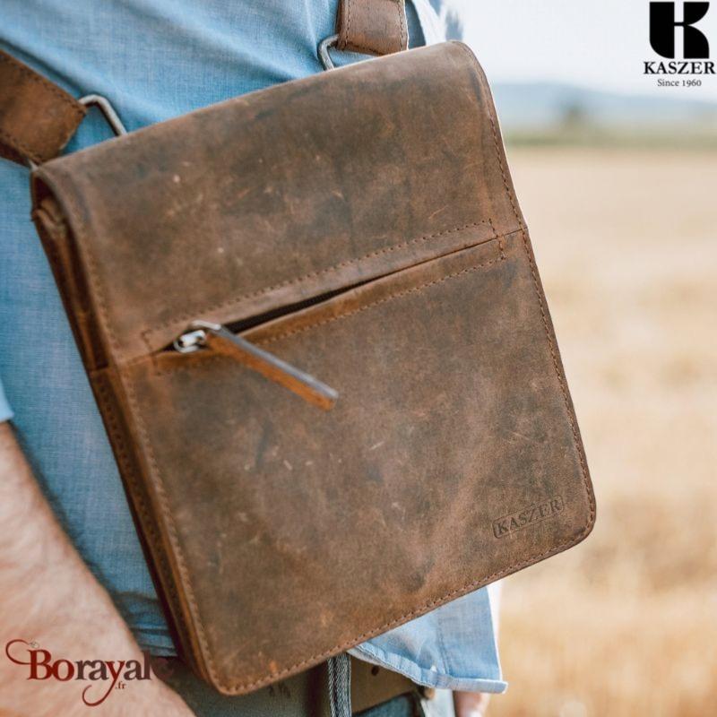 Sac bandoulière KASZER Kansas en cuir pleine fleur de buffle marron naturel foncé