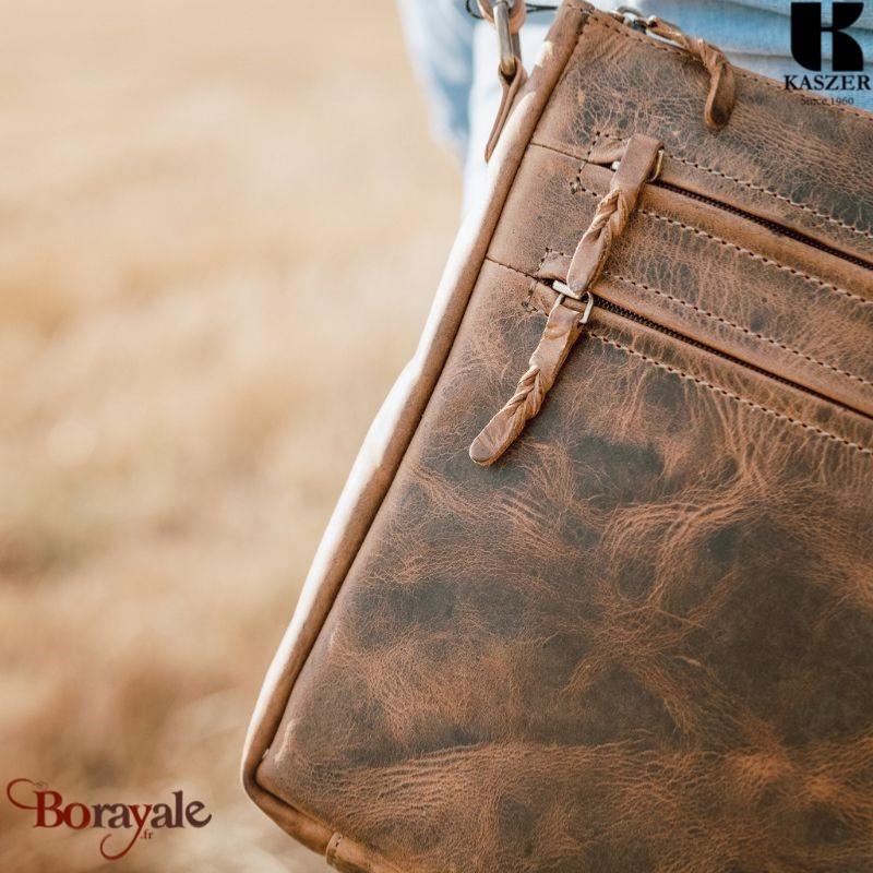 Sac bandoulière KASZER Wyoming en cuir de vachette pleine fleur brut brun naturel moyen